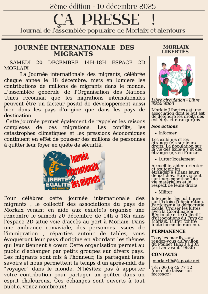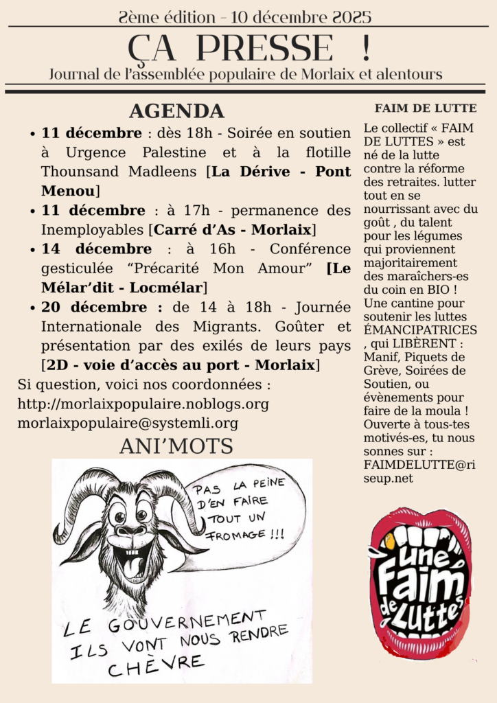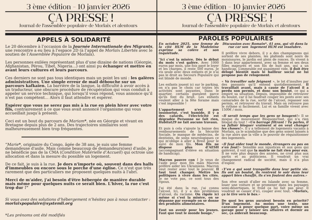 Si vous souhaitez contribuer à l’écriture ou à la diffusion du journal, n’hésitez pas à venir nous rencontrer à nos évènements. Vous pouvez également nous contacter sur morlaixpopulaire@systemli.org ! 🙂